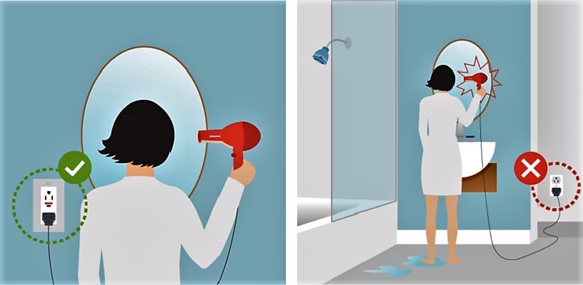Trong phòng tắm, bạn không nên cầm máy sấy tóc đang có điện khi tay ướt hoặc chân chạm nước. Hãy nhớ, nước dẫn điện rất tốt. Nếu chủ quan, bạn có thể gặp nguy hiểm.