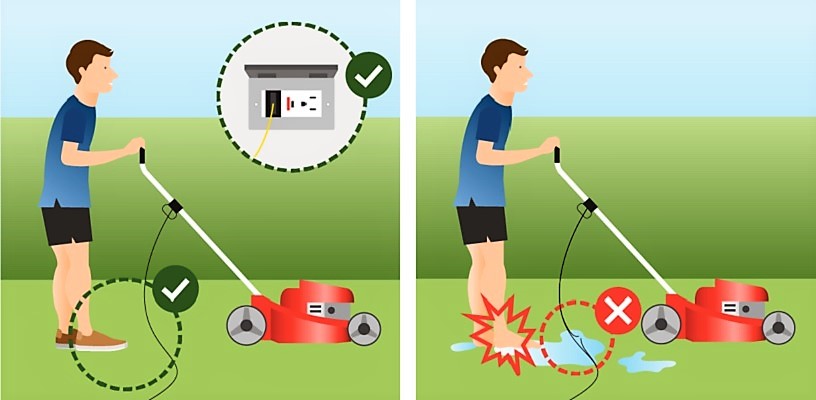Khi làm vườn, sử dụng máy cắt cỏ đang có điện, bạn không nên để chân trần chạm nước. Nên mang giày cao su hoặc giày nhựa khi làm vườn.