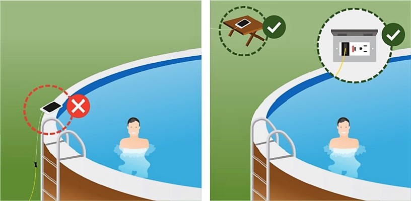 Bạn không nên để các dây dẫn điện hoặc nối dài dây dẫn điện đến các thiết bị ở gần hồ bơi, nhằm tránh nguy cơ rò rỉ điện.