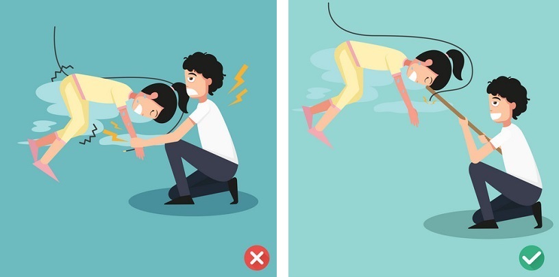 Khi kéo người bị điện giật ra khỏi nơi nguy hiểm, bạn phải dùng cây, gậy bằng gỗ để kéo nạn nhân ra. Tuyệt đối không dùng tay trần để kéo nạn nhân, kẻo chính bạn cũng bị điện giật.