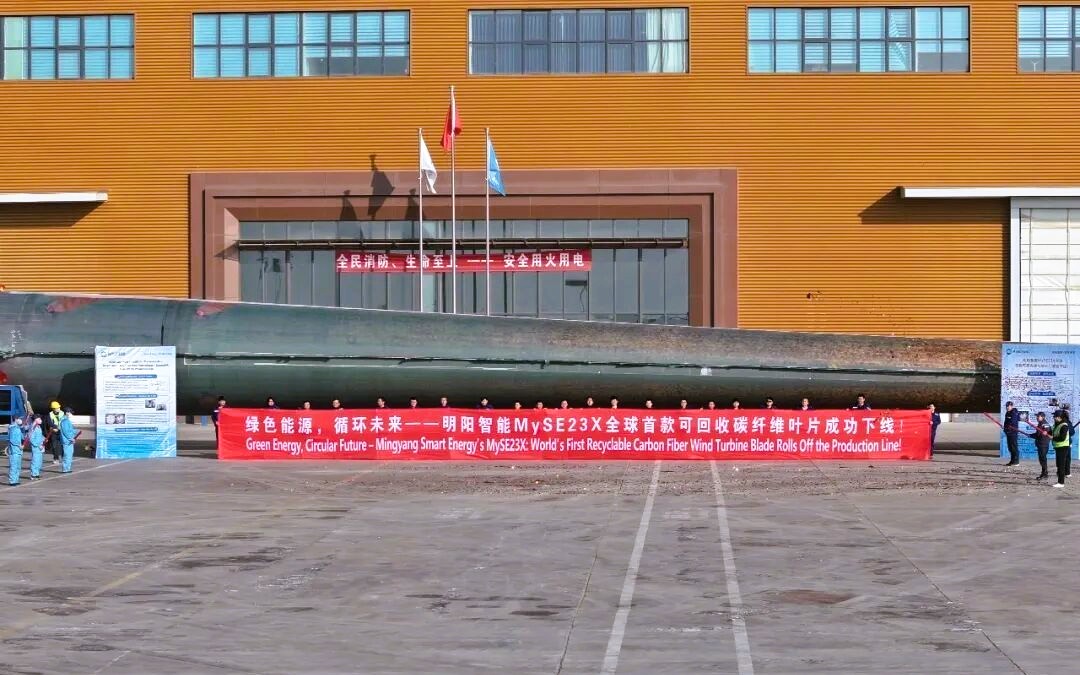 Công ty Ming Yang Smart Energy, Trung Quốc vừa ra mắt cánh quạt turbine gió bằng sợi carbon, có thể tái chế hoàn toàn đầu tiên trên thế giới, dài hơn 110 mét.
